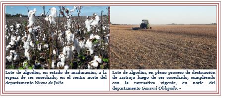 El proceso de cosecha avanzó a buen ritmo gracias a las condiciones climáticas que reinaron hasta que llegaron nuevamente las precipitaciones y el mismo se detuvo temporalmente. Debido a las condiciones de la época, días más cortos y temperaturas más bajas, la cosecha tardaría unos días más en volver a retomarse. Los rindes fueron bastante similares a las semanas anteriores, solo descendieron en algunos predios debido a que fueron más afectados por la falta de precipitaciones. Lotes que sufrieron un poco más la falta de precipitaciones estuvieron en el orden de los 1.400 kg/ha, lotes puntuales con riego superaron los 3.500 kg/ha. Y lotes sin riego, como rendimiento máximo estuvieron en valores de 2.800 kg/ha. Las principales tareas que se llevaron a cabo fueron: aplicación de defoliante para tumbar las hojas del cultivo para la cosecha, aplicación de herbicidas en lotes puntuales y fundamentalmente la aplicación de insecticidas para el control del picudo. A medida que fue avanzando la cosecha, se deberían ir destruyendo los rastros, ya que la fecha límite para esta tarea fue fijada, el 15 de junio para la zona este de Santa Fe (departamentos General Obligado, San Javier y Vera) y el 30 de junio para la zona oeste de Santa Fe (departamento Nueve de Julio). Fue significativa la reactivación de las trampas en los lotes defoliados y cosechados para la captura de la mayor cantidad de picudo y así la disminución de la población para la próxima campaña. Los estados fenológicos observados fueron; R “estados reproductivos”, formación de cápsulas, M “Maduración”, M1 (1° cápsula abierta) M2 (60% de cápsulas abiertas) a Madurez fisiológica