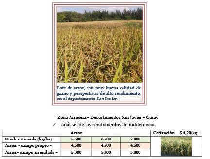 En el área arrocera, los días de precipitaciones, altos porcentajes de humedad ambiente, condiciones de inestabilidad, acortamiento de los días y menos horas de luz, influyeron en el proceso de cosecha que continuó en forma normal pero muy lento, alcanzando un grado de avance del 97 % del total del área, representando aproximadamente unas 31.040 ha, con un progreso intersemanal del 4 %. Los rendimientos se mantuvieron estables con rindes de 6.000 a 6.500 kg/ha, remarcándose la calidad comercial del grano, como consecuencia de la abundante radiación solar durante el período de floración y el llenado de grano, que fue la característica de importancia en esta campaña. La misma, de acuerdo a las condiciones ambientales proyectadas iría desmejorando hacia el final. Los valores de arroz cáscara obtenidos por parte del productor oscilaron en $ 4,20 y $ 4,30/kg por debajo de las expectativas del sector productivo, que sumado a ello, los elevados incrementos de las tarifas de un insumo primordial y fundamental como fue la energía eléctrica, para el riego del cultivo, presentó mucha preocupación e incertidumbre