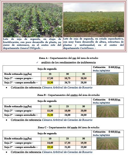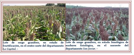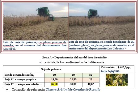 El proceso de cosecha comenzó en los departamentos del sur del área, con rendimientos muy variables y dispares, revelando las consecuencias del déficit hídrico y la ausencia de precipitaciones que padeció el cultivo en sus distintas etapas fenológicas. Los rendimientos mínimos promedios fluctuaron desde 4 – 5 – 6 qq/ha y los máximos 28 – 30 – 33 qq/ha con lotes puntuales de 40 qq/ha. Muy heterogéneos los resultados obtenidos, presentándose situaciones en que habiendo comenzado la trilla y no superando los 3 – 4 qq/ha de rendimiento, se resolvía la interrupción del proceso y el abandono del lote. Un 80 % del área sembrada presentó diferentes grados de afectación, situación que deterioró a los cultivares, los cuales comenzaron a reflejar dicha situación y variabilidad. Se observaron los siguientes estados fenológicos: R “estados reproductivos” en R3 (vaina de 5 mm de longitud en nudo), R4 (vaina de 20 mm de longitud en nudo), R5 (comienzo de llenado de semilla en nudo, semilla 3 mm de longitud) R6 – 1(semilla verde de tamaño máximo del nudo) R7 (comienzo de madurez, una vaina con color de madurez) y en un bajo porcentaje en R8 (madurez plena). particularmente en los departamentos del sur del área.