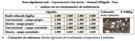 Los rendimientos en cada uno de ellos continuaron revelando la gran heterogeneidad, siendo la principal característica que rigió y regiría en la campaña 2017/2018. Prosiguió la cosecha en los distintos departamentos y en diferentes porcentajes en los siguientes cultivos: en arroz un 97 %, en algodón un 45 %, en sorgo granífero un 50 %, en soja de primera un 52 % y en soja de segunda un 8 %. El avance de la cosecha de soja de primera, continuó mostrando rendimientos variables y heterogéneos. Se estimó una reducción del 17 % en el rendimiento promedio del área, el que fluctuaría entre 29 y 29,5 qq/ha, reduciéndose de 6 a 6,5 qq/ha comparados con la campaña anterior, que en dicho cultivo fue de 35,5 qq/ha.