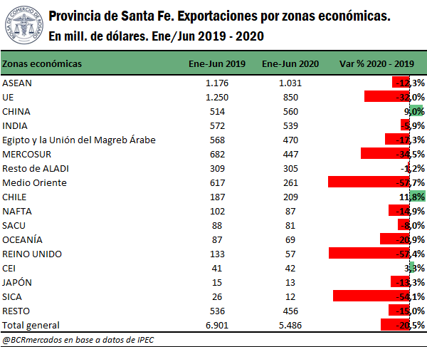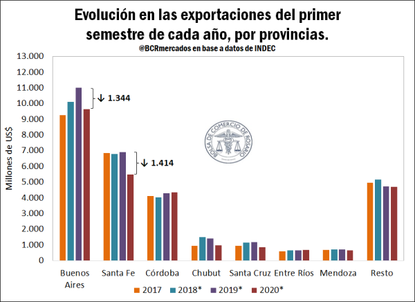 Tal como se ha comentado en ediciones anteriores del Informativo Semanal, las exportaciones del primer semestre de 2020 en Argentina se han ubicado en los US$ 27.336 millones. Dicho guarismo semestral es un mínimo de la última década y comparado con el año anterior, representa una caída del 11% en el valor exportado que equivale a unos US$ 3.454 millones. La composición de tal retracción se deriva de una caída del 6,3% en el índice de cantidades y del 5% en el índice de precios obtenidos por nuestros productos en el extranjero. En base a tales resultados, se prosigue con un análisis del desempeño exportador argentino a nivel provincial y específicamente de la provincia de Santa Fe.