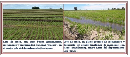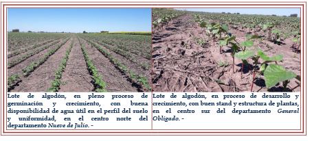a) proceso de siembra de arroz, algodón, sorgo granífero – forrajero y soja de primera, favorecido por las condiciones ambientales y la buena disponibilidad de agua útil en la cama de siembra.