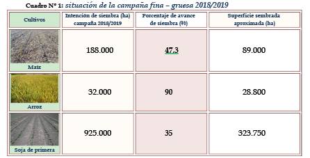 El cultivo de maíz presentó hasta la fecha, un avance en la siembra del 47,3 %, representando unas 89.000 ha. Las mismas correspondieron a lotes sembrados en primera instancia, denominado maíz de primera, el cual de acuerdo al área de estudio tendría dos usos, un porcentaje a grano para futura venta comercial y el otro porcentaje como forraje, para consumo animal bovino.