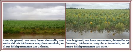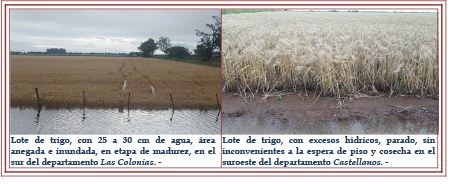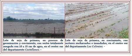 El proceso de cosecha detenido. Faltando la recolección del 35 % en los departamentos del norte del área. Un 65 % en los del centro y el 100 % en los del sur. Restando la cosecha de aproximadamente unas 257.590 has. Ante lo ocurrido y de acuerdo a los sectores de posiciones topográficas más bajas y deprimidas las cuales quedaron están totalmente anegadas, inundadas y