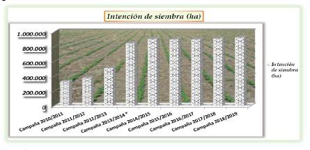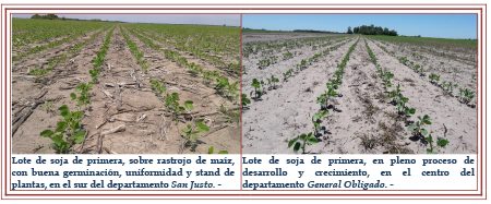 La intención de siembra sería similar a levemente superior a la superficie sembrada en 2017/2018, alcanzando las 925.000 ha. Se observaron, los siguientes estados fenológicos: V “estados vegetativos”, VE (emergencia), Vc (estado de cotiledón, hojas unifoliadas pegadas) V1 (1º nudo), V2 (2º nudo) y lotes más avanzados en un bajo número en V3 (3º nudo).