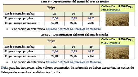 a) departamentos del norte del área de estudio, los rindes alcanzaron promedios mínimos de 18 a 20 qq/ha y promedios máximos de 32 a 34 qq/ha y máximo puntuales de 38 qq/ha.