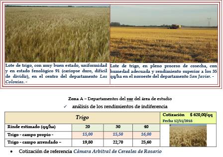 b) departamentos del centro del área de estudio, los rindes alcanzaron promedios mínimos de 20 a 22 qq/ha y promedios máximos de 38 a 40 qq/ha y máximo puntuales de 48 qq/ha. Hasta la fecha el estado sanitario del cultivo continuó siendo muy bueno, sin expresión de enfermedades ni de plagas. Se observaron, los siguientes estados fenológicos: 7 “grano lechoso” 75 (medio grano lechoso), 77 (grano lechoso avanzado) 8 “grano pastoso” 83 (comienzo de grano pastoso), 87 (pastoso duro) 9 “madurez” 91 (cariopse duro, difícil de dividir) y 92 (cariopse duro, no se marca con la uña).