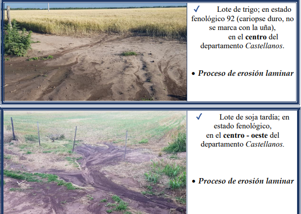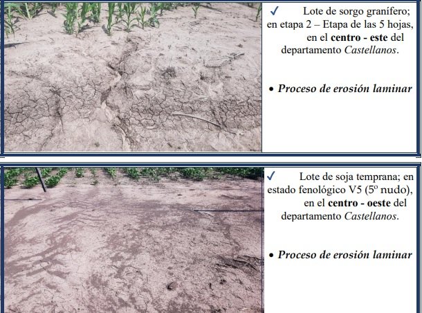 Erosión hídrica laminar o leve: varía de ligera a severa, es muy poco evidente en el campo a primera vista, pero con la pala, en pequeñas transectas se determina la variación en el espesor del horizonte superficial. Dicho proceso es cambiante en cortas distancias a lo largo de una pendiente. Sólo se observan escasos síntomas de arrastre de material y el suelo ha sufrido una pérdida de menos de 5 cm (o menos del 25 %) de su horizonte superior. El impacto de la gota de lluvia sobre los agregados del suelo, no protegidos, inicia el proceso de desintegración del mismo, el que continúa – luego de que el suelo se ha saturado – con el flujo superficial de escorrentía en un arrastre del material, como se observa en las fotografías expuestas, en los lotes con distintos cultivos.