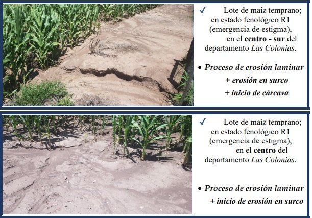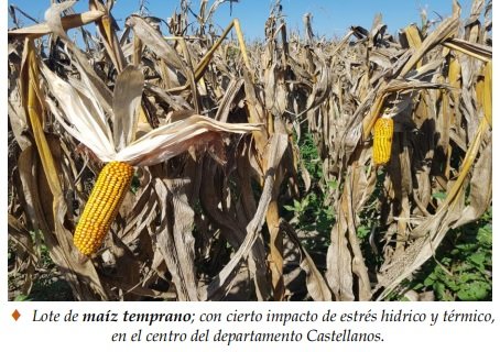 Condiciones de estabilidad reinaron la mayor parte de la semana, días secos y temperaturas elevadas permitieron que avance el proceso de recolección del maíz temprano. Lo que se observó particularmente en los 11 departamentos del norte y centro – este del SEA, mientras que en los del sur hubo muy poco movimiento de equipos y cosechadoras, situación que se revertiría en las próximas jornadas. Por lo tanto, se incrementaría el ritmo y aumentaría la superficie cosechada, ante lo cual se estaría en plena recolección del maíz y se cuantificaría concretamente el real impacto que tuvo el clima, fundamentalmente en las etapas finales del desarrollo de los maizales y por la heterogénea reacción al cambio, que manifestó cada lote. La sanidad de los sembradíos se encontró muy bien, sin presencia de insectos ni de enfermedades. Se observaron los siguientes estados fenológicos: R “estados reproductivos”, R4 (grano pastoso), R5 (grano dentado) y los más avanzados, en R6 (madurez fisiológica).