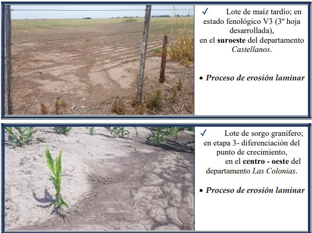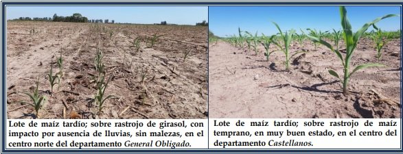 En los distintos departamentos del SEA, el maíz tardío o de segunda, presentó estados muy variables, condicionados por la realidad climática en la cual se desarrollaron. Los maizales manifestaron gran amplitud de estados vegetativos, por lo que se encontraron desde muy buenos o excelentes a malos, incluso en un mismo departamento, situación que se detectó en toda el área de estudio. Un interrogante que se seguiría monitoreando y evaluando, sería la incorporación de tecnología. Se encontró a los cultivares en los siguientes estados fenológicos que oscilaron desde: V “estados vegetativos”, Ve (emergencia), V1 (1º hoja desarrollada), V2 (2º hoja desarrollada), V3 (3º hoja desarrollada), V4 (4º hoja desarrollada), V5 (5º hoja desarrollada), V6 (6º hoja desarrollada), V7 (7º hoja desarrollada), V8 (8º hoja desarrollada), V9 (9º hoja desarrollada) y los más avanzados, en Vt (panojamiento).