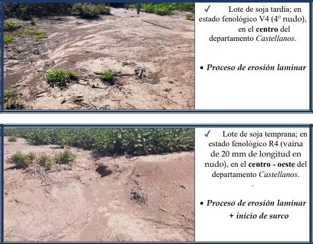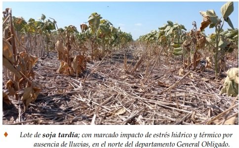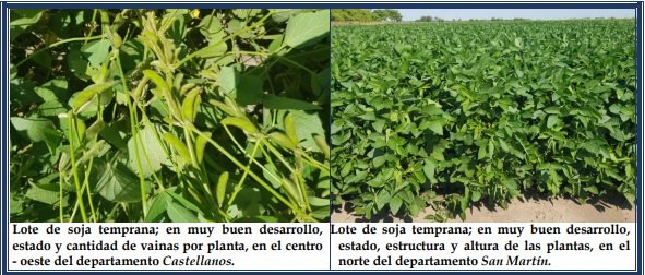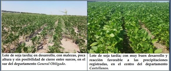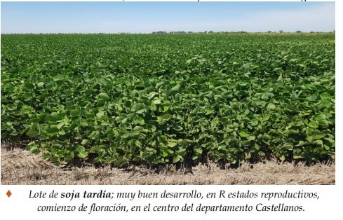 Se observaron variaciones en los lotes de la soja tardía, como consecuencia de la ausencia de precipitaciones de importancia y el déficit hídrico, que incidieron sobre el cultivo. Un 60 % de los sojales se encontraron en buen a muy buen estado, con buen desarrollo de las estructuras de las plantas y en un importante número de ellos, se llegó a los cierres parciales o totales de los surcos. Un 25% reaccionó más lentamente, dadas las precipitaciones irregulares o la etapa fenológica en que se encontraban y el 15% restante continuó en situación irreversible, con pérdida por mortandad, especialmente en los sembradíos con limitaciones edáficas en sus suelos. Se aplicaron herbicidas, para el correcto manejo de las malezas y en lotes puntuales se aplicó insecticida, para el óptimo control de los insectos. Se observaron los siguientes estados fenológicos: V “estados vegetativos”, V3 (3º nudo), V4 (4º nudo), V5 (5º nudo), V6 (6º nudo), V7 (7º nudo), R “estados reproductivos”, R1 (inicio de floración), R2 (floración con uno de los nudos superiores con hojas desarrolladas) y los más avanzados, en R3 (vaina de 5 mm de longitud en nudo).