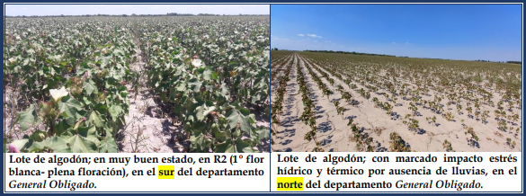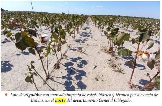 El estado de los algodonales continuó siendo muy variable a nivel general, debido a las precipitaciones ocurridas en cada zona, siendo los más perjudicados los de la parte norte de los departamentos General Obligado y Vera, donde las pérdidas se incrementaron con el transcurso de los días y llegaron a situciones irreversibles el 95 a 100 % de ellos. Los mayores daños ocurrieron en el número de cápsulas retenidas, la caída prematura de las hojas, escaso crecimiento y generación de estructuras reproductivas. Además, se aceleró puntualmente el proceso de apertura de las cápsulas, por lo que, como medida agronómica se realizaron aplicaciones de reguladores de crecimiento con dosis completas, para la interrupción del desarrollo de las plantas y así, la posible retención, para su futura cosecha durante los próximos días. En los lotes, donde se perdió toda la carga, como última opción, se los dejó a la espera de lluvias, para la posible generación de nuevas estructuras reproductivas, reiniciándose el ciclo, prolongándose su recolección hasta los meses de junio o julio, siempre que las condiciones climáticas lo posibiliten, con todo el riesgo que implicaría el manejo de la influencia del picudo algodonero. Ante la principal plaga del cultivo, el picudo algodonero (Anthonomus grandis Boheman), continuaron siendo muy exhaustivos los monitoreos de las trampas y también se recorrieron los lotes inspeccionando las estructuras florales para la detección temprana de su presencia, llevándose a cabo aplicaciones que posibilitaron su control. Se observaron los siguientes estados fenológicos: V “estados vegetativos”, V8 (octava hoja verdadera desplegada), R “estados reproductivos”, R1 (aparición del primer pimpollo), R2 (1º flor blanca – plena floración), desarrollo de cápsulas, M “maduración”, M1 (1º cápsula abierta) y los más avanzados, en M2 (60 % de cápsulas abiertas).