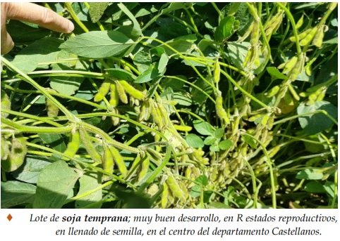 Período donde dominó la ausencia de importantes precipitaciones y con temperaturas medias a altas, por lo que se observó disminución de humedad en los suelos y variaciones en el desarrollo de la soja temprana. Un 80% de los cultivares se encontró en estado bueno a muy bueno y algunos lotes excelentes, como consecuencia de los cambios en las condiciones climáticas que generaron las lluvias de mediados hasta fines de enero. En el 20 % restante del área implantada, el impacto de la ausencia de precipitaciones y el elevado régimen térmico durante los primeros 16 días del año, dejaron indicadores muy marcados, tales como, limitaciones en el crecimiento de 13 las plantas, amarillamiento o marchitamiento de las hojas basales y en lotes puntuales, la pérdida de ejemplares por mortandad, realidad irreversible. Se aplicaron insecticidas para el óptimo manejo de los insectos. Se observaron los siguientes estados fenológicos: R “estados reproductivos”, R1 (inicio de floración), R2 (floración con uno de los nudos superiores con hojas desarrolladas), R3 (vaina de 5 mm de longitud en nudo), R4 (vaina de 20 mm de longitud en nudo), R5 (comienzo de llenado de semilla en nudo) y los más avanzados, en R6 1 (semilla verde de tamaño máximo del nudo)