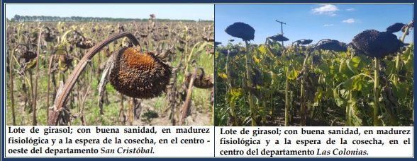 El proceso de cosecha del girasol tuvo continuidad con ritmo lento pero sostenido, en los últimos lotes de los departamentos del noroeste, centro y sur del área de estudio. El período de recolección de la oleaginosa, durante la campaña 2021-2022, se demoró y amplió, por la prolongación de la fecha de siembra, como consecuencia de la irregularidad geográfica de las precipitaciones ocurridas. Hasta la fecha presentó un grado de avance del 95 %, progreso intersemanal de 10 puntos y un adelanto de 7 puntos porcentuales, en comparación a la campaña pasada. Los rendimientos promedios mínimos o máximos logrados se mantuvieron sin variación hasta la fecha y en los diferentes departamentos fueron: a) General Obligado, Vera y norte de San Javier, de 9 – 11 a 13 qq/ha, de 28 a 30 qq/ha con lotes puntuales de 34 qq/ha, b) Nueve de Julio y San Cristóbal de 8 a 10 qq/ha, de 25 a 28 qq/ha con lotes puntuales de 31 qq/ha, c) Las Colonias, San Justo, La Capital y Castellanos de 10 a 13 qq/ha, de 26 a 30 qq/ha con lotes puntuales de 33 qq/ha y d) San Martín y San Jerónimo de 9 a 11 qq/ha, de 26 a 28 qq/ha con lotes puntuales de 32 qq/ha. El sector productivo continuó manifestando inquietud por la numerosa presencia de palomas o cotorras, que afectaron y afectarían los capítulos. Realidad constante en cada campaña, con aumento de los daños y perjuicios sobre los rendimientos. Se observó el siguiente estado fenológico: R “estados reproductivos”, R9 “madurez fisiológica” (parte de atrás del capítulo y las brácteas de color amarillento a marrón oscuro).