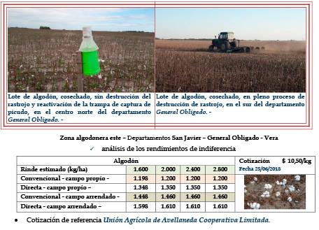 El proceso de cosecha logró un avance hasta la fecha del 82 %, con un progreso intersemanal de 6 puntos y un retraso de 8 puntos porcentuales en referencia al ciclo anterior. El mismo continuó a buen ritmo debido a los días soleados y a las condiciones climáticas de estabilidad. 3 En el sector Este del área algodonera provincial, la cosecha finalizó, con un rendimiento promedio que osciló entre los 1.950 a 2.050 kg/ha. Los últimos lotes bajaron el rendimiento debido a las condiciones climáticas que atravesaron. En el sector Oeste la recolección prosiguió sin inconvenientes, con rendimientos promedios que fluctuaron entre 1.200 a 2.000 kg/ha, evidenciando diferentes grados de afectación en calidad y cantidad por las condiciones ambientales registradas. Se recuerda que se deberían ir destruyendo los rastrojos, ya que la fecha límite para esta tarea fue fijada: el 15 de junio para la zona este de Santa Fe (departamentos General Obligado, San Javier y Vera) y el 30 de junio para la zona oeste de Santa Fe (departamento Nueve de Julio). Sería fundamental la reactivación de las trampas en los lotes defoliados y cosechados para la captura de la mayor cantidad de picudos, lográndose así la disminución de la población para la próxima campaña. Los estados fenológicos observados fueron; R “estados reproductivos” Madurez fisiológica.