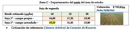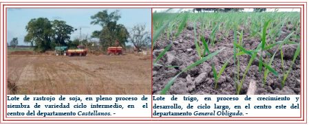 Continuó en toda el área el proceso de siembra, dadas las óptimas condiciones de la disponibilidad de agua útil en la cama de siembra y a los aspectos comerciales imperantes que sostuvieron al cultivo. Los cultivares implantados hasta la fecha pertenecieron a las variedades de ciclo largo en un 90 % y ciclo intermedio un 10 %. Los que han tenido una buena a muy buena germinación, logrando un muy buen stand de plantas por ha. A futuro solamente se estarían sembrando variedades de ciclo intermedio y corto. Se observaron, los siguientes estados fenológicos: “germinación”, 07 (emergencia del coleóptilo), 09 (hoja en el extremo del coleóptilo), 1 “crecimiento de la planta” 11 (primera hoja desarrollada), 12 (dos hojas desarrolladas), 13 (tres