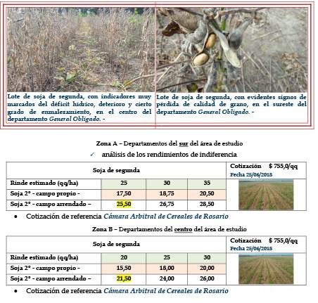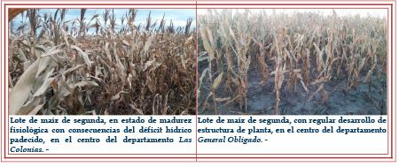 Sin variación en la semana, un 80 % del área sembrada, mostró distintos grados de afectación y síntomas característicos de dichos períodos y el 20 % restante reveló estado bueno y lotes puntuales muy buenos. Ante las características ambientales que se registraron en las últimas semanas, aumentaron los grados de enmalezamiento de los lotes, como así también el deterioro de los cultivares. Los primeros análisis de humedad de grano en espiga fueron de 20 a 25 %, lo que evidenció un alto porcentaje de humedad, condición que regularía el comienzo del proceso de cosecha. Se observaron, en toda el área, los siguientes estados fenológicos: R “estados reproductivos” R5 (grano dentado) y los más avanzados en R6 (madurez fisiológica).