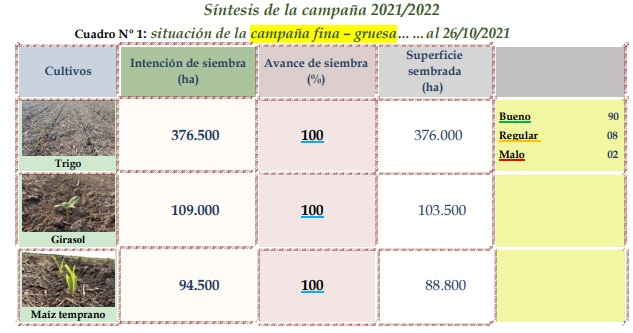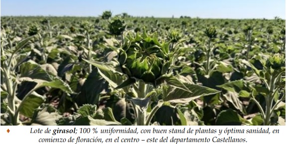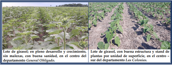 El agua útil de los perfiles de los suelos se mantuvo en las áreas donde las precipitaciones fueron mayores y posibilitaron el crecimiento normal de los girasoles, que en general presentaron buen estado, con un buen número de plantas, homogéneas y vigorosas. En cuanto al estado sanitario, hasta el momento no se detectaron plagas ni enfermedades, pero prosiguió el monitoreo de los predios, por posible presencia de orugas cortadoras (Agrotis spp) y también se los continuó analizando minuciosamente, para la detección temprana del mildew (Plasmopara halstedii). Se observaron los siguientes estados fenológicos: V “estados vegetativos”, V3 (3º par de hojas verdaderas), V4 (4º par de hojas verdaderas), V5 (5º par de hojas verdaderas), V7 (7º par de hojas verdaderas), V8 (8º par de hojas verdaderas), V9 (9º par de hojas verdaderas), R “estados reproductivos”, R2 (distancia de menos de 2 cm entre la inserción del botón floral y la última hoja) y los más avanzados, en comienzo de R3 (distancia de más de 2 cm entre la inserción del botón floral y la última hoja).