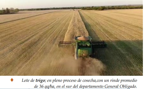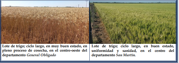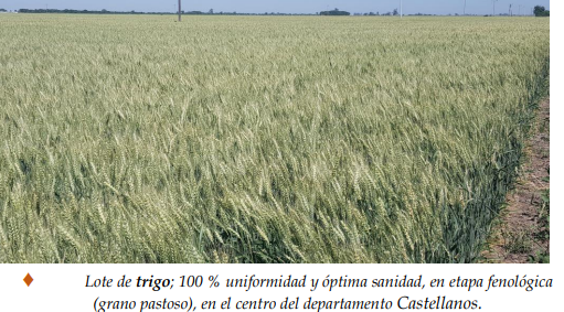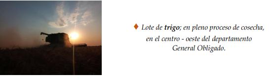 La estabilidad climática al comienzo de la semana permitió de manera normal el avance de la cosecha de trigo, en particular en el norte del área de estudio, en los departamentos General Obligado, Vera, Nueve de Julio y noroeste de San Javier. El progreso continuó hasta el día viernes, dado que se produjeron nuevamente precipitaciones de variadas intensidades y gradualmente se reinició la trilla, dependiendo de los milímetros caídos en cada zona. Los rendimientos obtenidos mostraron el impacto de las lluvias producidas a lo largo del ciclo del cereal, donde fueron normales y donde fueron escasas en alguna etapa de su ciclo. Hasta el momento, los valores logrados reflejaron dicha situación, ya que los mismos oscilaron entre mínimos de 11-12 qq/ha y máximos que llegaron a los 40 qq/ha. Los días soleados, generaron condiciones estables y favorables para los trigales y hasta la fecha no se detectaron plagas ni enfermedades. Se determinaron los siguientes estados fenológicos: 5 “emergencia de la inflorescencia”, 51 (primeras espiguillas de la inflorescencia visibles), 55 (mitad de la inflorescencia emergida), 59 (emergencia completa de la inflorescencia), 6 “antesis”, 61 (comienzo de antesis), 65 (mitad de antesis), 69 (antesis completa), 7 “grano lechoso”, 75 (medio grano lechoso), 77 (grano lechoso avanzado), 8 “grano pastoso”, 83 (comienzo de grano pastoso), 87 (pastoso duro) y los más avanzados, en 9 “madurez”, 91 (cariopse duro, difícil de dividir), 92 (cariopse duro, no se marca con la uña).