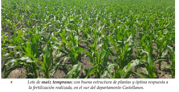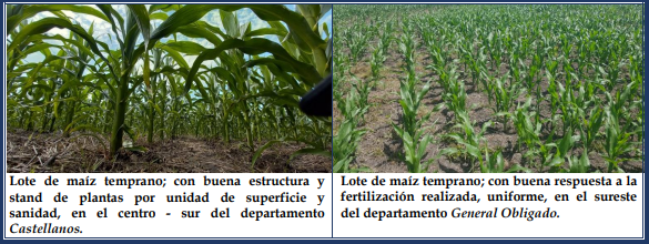 Los maizales continuaron su crecimiento normal, pero en algunos lotes puntuales, se observó el efecto de las heladas, localizado en el área foliar, que cambió de coloración verdosa a amarillenta. Se detectó la muy buena reacción de los cultivares a las fertilizaciones efectuadas. El estado sanitario de los mismos se encontró muy bien, sin plagas ni enfermedades. Se observaron los siguientes estados fenológicos: V “estados vegetativos”, Ve (emergencia), V1 (1º hoja desarrollada), V2 (2º hoja desarrollada), V3 (3º hoja desarrollada), V4 (4º hoja desarrollada), V5 (5º hoja desarrollada), V6 (6º hoja desarrollada), V7 (7º hoja desarrollada) y los más avanzados, en V8 (8º hoja desarrollada).