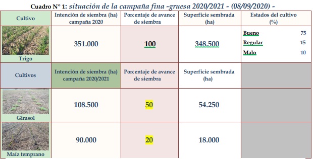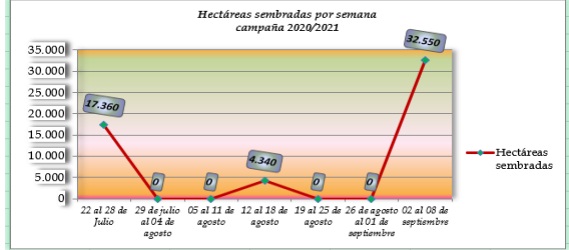 Hasta la fecha, se logró un avance del orden del 50 %, o sea, 54.250 ha, con referencia a la intención inicial, que se estimó sería similar a la campaña del año anterior, que alcanzó las 108.500 ha
