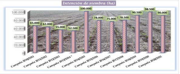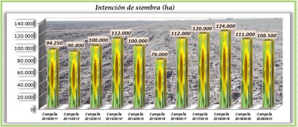 La intención de siembra se estimó en unas 90.000 ha, un 8,6 % inferior al área sembrada la campaña anterior, que fue de 98.500 ha.