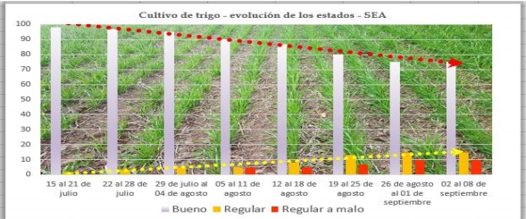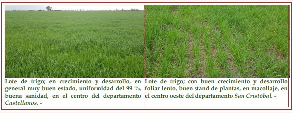 Los trigales comenzaron su respuesta a dicho cambio y con el transcurso de los días se evaluaría y cuantificaría la eficiencia alcanzada por las lluvias acaecidas. Los cultivares continuaron su ciclo, presentándose hasta la fecha: • un 75 %, con buen desarrollo en los diferentes lotes, así como en el inicio de su ciclo. Buena respuesta a la fertilización y también buen estado sanitario, en el área de estudio. Aquí se concentraron, casi en su totalidad, las variedades de ciclos largos y más del 60 %, los de ciclos intermedios. • un 15 %, en estado regular, que con el transcurso de los días, ante la decreciente disponibilidad de agua útil, después de una buena germinación y emergencia, evidenciaron síntomas de déficit hídrico, observándose lotes no uniformes, en particular, lo sembrado en la segunda etapa, con trigos de ciclos intermedios y cortos. • el restante 10 %, se halló en estado regular a malo, con ciertos inconvenientes en los nacimientos y en los stands de plantas por unidad de superficie, coloración pálida, con sectores amarillentos en su área foliar, ubicándose geográfica y particularmente en los extremos suroeste y noroeste del SEA