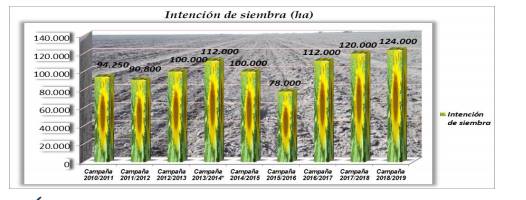 el inicio, dicha actividad se registró en todos los departamentos del área de estudio. Se estimó una intención de siembra de 90.500 ha aproximadamente, representando un incremento del 16 % en comparación a la superficie sembrada enla campaña anterior.