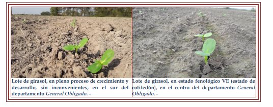 Las temperaturas registradas en este período fueron medias a bajas, lo cual posibilitó un buen proceso de emergencia y crecimiento, normalizando así el desarrollo. Se observaron los siguientes estados fenológicos: V “estados vegetativos”, VE (estado de cotiledón), V1 (1º par de hojas de más de 4 cm de largo) y los más avanzados en V3 (3º par de hojas verdaderas).