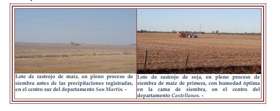 Las tareas realizadas en la semana fueron principalmente dos, siendo la primera la de mayor intensidad: a) en los departamentos del centro norte de la provincia de Santa Fe, favorecidos por las condiciones ambientales, continuó el proceso de siembra de girasol y maíz de primera. Con óptimas condiciones y muy buena disponibilidad de agua útil en la cama de siembra.