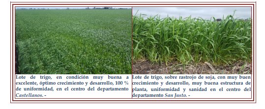 Los pronósticos enunciados en el informe anterior se cumplieron. La inestabilidad climática se manifestó en todos los departamentos del área de estudio. Se registraron precipitaciones entre 10 y 80 mm, pero los mayores montos ocurrieron en sectores muy puntuales. Las lluvias se caracterizaron por su “baja intensidad”, permitiendo una muy buena infiltración del líquido elemento en los suelos, resultando muy oportuna eficiente y beneficiosa para los cultivos de la presente campaña. Por lo cual la disponibilidad de agua útil en los suelos fue óptima, cubriendo la demanda de los cultivos, que fue aumentando con el desarrollo de los estados fenológicos, principalmente de los cultivares de trigo.