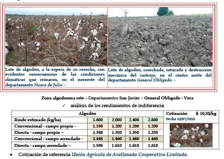 El proceso de cosecha logró un avance hasta la fecha del 95 %, con un progreso intersemanal de 5 puntos y un retraso de 5 puntos porcentuales en referencia al ciclo anterior. 3 El mismo continuó a ritmo lento en el sector oeste del área algodonera de la provincia de Santa Fe. Condiciones climáticas de estabilidad en la mayoría del período, pero con porcentajes altos de humedad, que condicionaron la tarea de recolección. Los rendimientos promedios que fluctuaron entre 1.000 a 1.800 kg/ha, continuaron con la disminución enunciada en el informe anterior y con diferentes grados de afectación en la calidad, por las condiciones ambientales registradas. Se recuerda la necesidad de la destrucción de los rastrojos, que deberían haberse degradado, ya que las fechas límites para dicha tarea fueron fijadas: el 15 de junio para la zona este de Santa Fe (departamentos General Obligado, San Javier y Vera) y el 30 de junio para la zona oeste de Santa Fe (departamento Nueve de Julio), para ambos casos ya se cumplió. Por ende, podrían sancionarse a los productores que no hubiesen cumplido con la reglamentación vigente. Sería fundamental la reactivación de las trampas en los lotes defoliados y cosechados para la captura de la mayor cantidad de picudos, lográndose así la disminución de la población para la próxima campaña. El estado fenológico observado fue; R “estados reproductivos” madurez fisiológica.