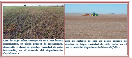 El grado de avance en el proceso de siembra hasta la fecha fue del orden del 95 %, lo que representó unas 332.500 ha aproximadamente, por sobre la intención inicial. Manteniéndose las buenas condiciones ambientales en toda el área, de disponibilidad de agua útil en la cama de siembra y en los aspectos comerciales vigentes que se evidenciaron y sostuvieron desde el comienzo de la presente campaña. Los sembrados en este período correspondieron a variedades de ciclo corto. Desde el inicio hasta la fecha la totalidad de lo implantado ha tenido una buena a muy buena germinación, logrando un muy buen stand de plantas, crecimiento, desarrollo de hojas y sistema radicular. Los lotes sembrados en la última quincena, no han sido afectados por las secuencias de heladas. Tampoco se detectó la presencia de enfermedades ni plagas. Se observaron, los siguientes estados fenológicos: 0 “germinación”, 07 (emergencia del coleóptilo), 09 (hoja en el extremo del coleóptilo), 1 “crecimiento de la planta” 11 (primera hoja desarrollada), 12 (dos hojas desarrolladas), 13 (tres hojas desarrolladas), 14 (cuatro hojas desarrolladas) y unos pocos lotes más avanzados, en muy bajo porcentaje 2 “macollaje” 21 (un tallo principal y un macollo).