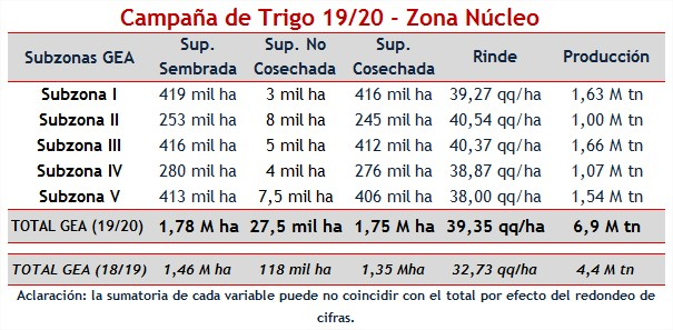 Con tan solo un 22% más de siembra, la campaña 2019/20 dejó un 57% más de trigo que en la 2018/19. Las estimaciones hechas con encuestas daban cuenta de un aumento de siembra de un 10% (1,6 M de ha), pero los satélites confirmaron mucho más: al final el trigo cubrió 1,78 M de ha. Se trata de la siembra más importante y el mayor volumen de la historia triguera de la región. Cuando comenzó la siembra el horizonte productivo señalaba la meta de cosechar 6 Mt. El trigo, soportó la falta de agua y desbordó la marca con la cifra final de producción de 6,9 Mt. De esta manera se alza con el indiscutible título de nuevo bastión triguero de argentina, aportando el 35% al total de la cosecha nacional, que fue también récord con 19,5 Mt.