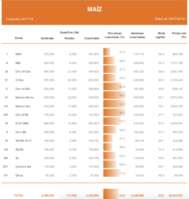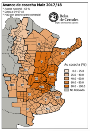 En la provincia de Córdoba la cosecha tomó impulso durante la última semana, en especial en los departamentos del norte donde gran parte de los lotes se corresponden con planteos tardíos. En las zonas Núcleo Norte y Sur aún restan por recolectar más de 50.000 Ha de cuadros del cereal que poseen niveles de humedad en los granos por sobre el óptimo. Sobre la zona del NOA ya se ha logrado cosechar el 31 % del área apta, mientras que las pérdidas ascienden a 8.000 Ha. Hacia la región del NEA la recolección continua a buen ritmo sobre la provincia de Santiago del Estero, en cambio hacia Chaco la humedad ambiental ralentizó las labores durante los días previos a este informe. En zonas Oeste de Bs. As.-Norte de La Pampa, Cuenca del Salado y el Centro de Bs. As. se da en paralelo la cosecha de los últimos lotes tempranos junto con la recolección de los cuadros sembrados durante los meses de diciembre y enero.