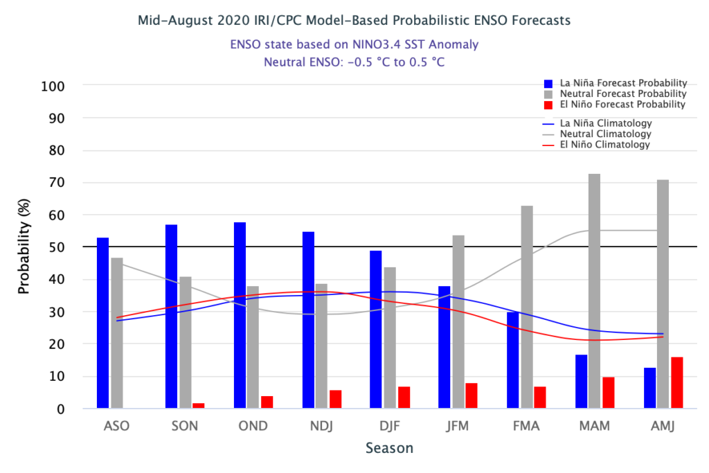 En relación con el fenómeno El Niño-Oscilación del Sur, Adela Veliz señaló que según el informe del International Research Institute for Climate and Society publicado a mediados a mediados de agosto, los modelos dinámicos y estadísticos indican, en promedio, un 57% de probabilidad de desarrollo de una Niña en el trimestre septiembre-octubre-noviembre.