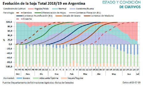 Salvo las regiones recién citadas, que mantuvieron excesos de humedad desde finales de enero a la fecha, el resto del área agrícola registró muy buenas condiciones ambientales El retraso en la siembra, producto de lluvias y bajas temperaturas registradas durante el período de incorporación del cultivo, comprometió el crecimiento de las plantas, las que en muchos casos alcanzaron un tamaño inferior a lo normal. Pese a ello, durante gran parte del ciclo del cultivo predominó una favorable condición hídrica que permitió compensar la falta de área foliar al permitir fijar un gran número de vainas por plantas y alcanzar excelentes rendimientos en la gran mayoría de las regiones bajo estudio.