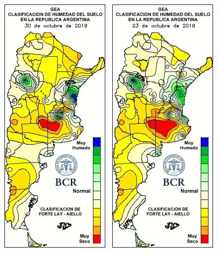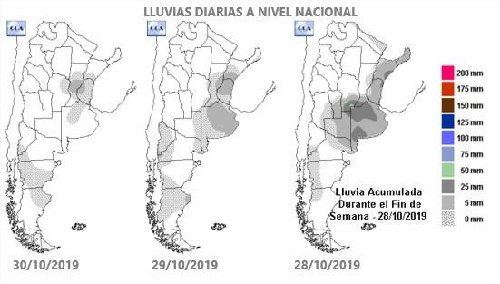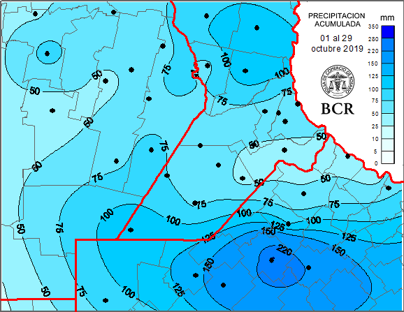 Los últimos quince de días del mes fueron claves para que las lluvias alcanzaran las medias históricas mensuales de 80 a 120 mm. El norte bonaerense finalizó octubre con acumulados que superaron los 100 mm. La precipitación media mensual para Junín es de 123 mm, y este mes de octubre la localidad marcó 221,7 mm. Chacabuco registró 215,7 mm y Lincoln 173 mm. Pero el 65% de la región quedó con lluvias por debajo de 80 mm. En Córdoba, BellVille acumuló 56 mm y Monte Buey 66 mm. Al sur de Santa Fe, Santa Teresa registró 48 mm y Bigand 50 mm. Buenos Aires, Ramallo acumuló solo 46 mm y Pergamino 58 mm, menos de la mitad de su media histórica: 107 mm.