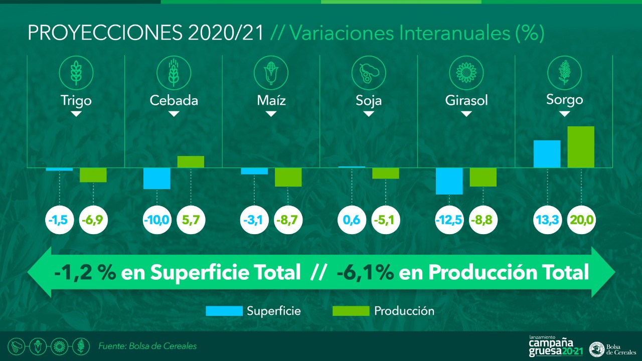 Por su parte, Esteban Copati, jefe de Estimaciones Agrícolas de la Bolsa de Cereales, destacó que el escenario climático será determinante este año, limitando no solo el área sembrada sino también los rendimientos previstos para cada uno de los cultivos más importantes de Argentina. En consecuencia, se prevén reducciones interanuales de -1,2 % en la superficie sembrada y de -6,1 % en la producción, que alcanzarían 33,15 millones de hectáreas y 120,8 millones de toneladas respectivamente. Los cultivos más afectados serían el trigo, el maíz y el girasol. De confirmarse este escenario, sería la segunda campaña consecutiva con caída en los números totales.