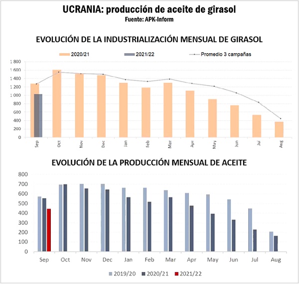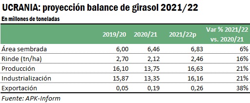 Con este incremento en el área sembrada y en los rendimientos esperados, se espera que Ucrania logre una cosecha récord de 16,7 Mt que le permitirá industrializar 16,2 Mt de girasol, augurando una gran campaña exportadora para el aceite.
