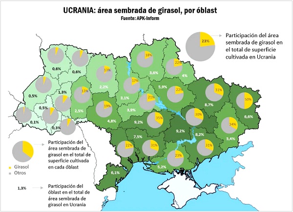 En Ucrania, los agricultores siembran el 23% de la superficie cultivada del país con girasol. Si bien el cultivo de la oleaginosa está presente en los 24 óblasts (división política) de Ucrania, es particularmente intensivo en la región del sudeste. De hecho, esta región concentra más del 65% de la producción nacional.