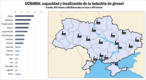 De acuerdo con las estimaciones de APK-Inform, Ucrania procesará 16,2 millones de toneladas de girasol 2021/22, lo que constituirá un récord para esta industria. La capacidad instalada del sector está dispersa en diferentes regiones del país. La mayoría de las plantas de mayor escala se ubican en torno a puertos sobre el Mar Negro (Odesa, Mykolaiv, Kherson) o a vías navegables internas (Dnipro, Zaporizhzhia), que están a su vez próximos a la principal zona productiva. Estas industrias representan la mitad de la capacidad instalada en Ucrania. Sin embargo, otras como Kropyvnytsky se ubican en medio de las tierras productivas, en tanto que otras plantas como Khmelnitsky o Vinnysta se emplazan en la región noroeste del país. La presencia de industria en esta zona auspicia también el crecimiento de la producción en esta región.