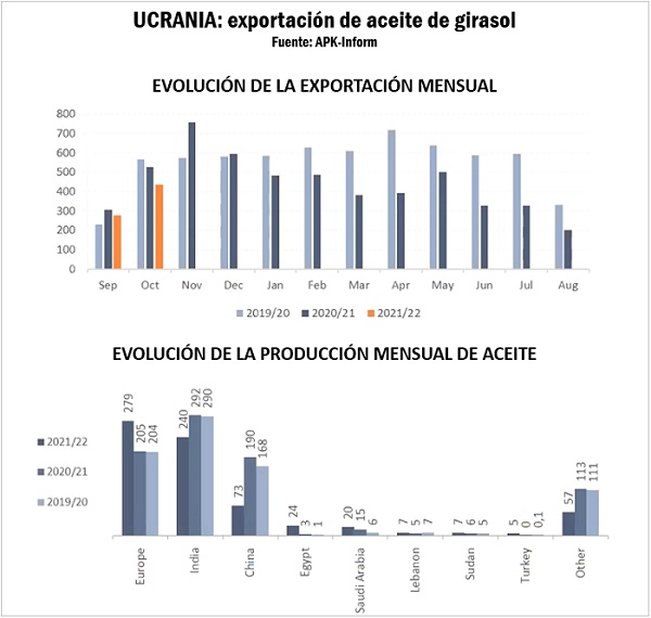 El mercado europeo, en contraste con lo señalado para China e India, incrementó sus compras de aceite ucraniano. Esto se deriva fundamentalmente de la suba en el precio del gas, que generó la necesidad de importar mayor cantidad de aceite. En el año comercial actual, sus importaciones crecieron un 36% y compensando casi el 45% de la disminución de ventas a China y Asia. Con compras por 279.000 toneladas, la Unión Europea (más Reino Unido) se posiciona como el primer destino de exportación para el aceite de girasol esta campaña.