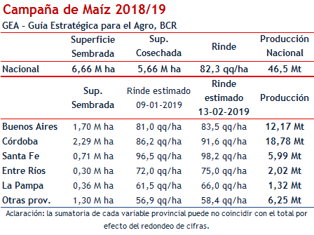 Ajustes al alza en la estimación de febrero permiten subir en un 5,7% el volumen de la cosecha de grano comercial respecto del guarismo anterior (44 millones de toneladas). La campaña maicera 2018/19 alcanzaría con 46,5 millones de toneladas de producción, un nivel récord de producción. El rinde nacional se ha estimado en 82,3 qq/ha, cuando la estimación previa era de 78,8 quintales. El número de producción se compone, por ende, de esa cifra de productividad unitaria y de un nivel de siembra de 6,66 M de ha y una superficie destinada a grano comercial de 5,66 M de ha.