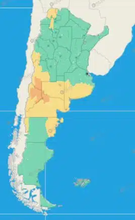 Buenos Aires: Ayacucho – Balcarce – General Guido – Maipú – Noroeste de General Juan Madariaga – Noroeste de Mar Chiquita – Oeste de General Pueyrredón – Costa de General Pueyrredón – Costa de Mar Chiquita – General Alvarado – Zona serrana de Benito Juárez – Zona serrana de Loberia – Zona serrana de Necochea – Zona serrana de Tandil – Azul – Rauch – Tapalqué – Zona baja de Benito Juárez – Zona baja de Tandil – Adolfo Gonzales Chaves – Centro de Lobería – Norte de Coronel Dorrego – Norte de Necochea – Norte de San Cayetano – Norte de Tres Arroyos – Costa de Patagones – Costa de Bahía Blanca – Costa de Coronel Dorrego – Costa de Coronel de Marina Leonardo Rosales – Costa de Villarino – Monte Hermoso – Norte de Bahía Blanca – Oeste de Patagones – Oeste de Villarino – Puan – Zona baja de Coronel Pringles – Zona baja de Coronel Suárez – Zona baja de Saavedra – Zona baja de Tornquist – Adolfo Alsina – Daireaux – Guaminí – Pellegrini – Salliqueló – Trenque Lauquen – Tres Lomas – General La Madrid – Laprida – Olavarría – Costa de Lobería – Costa de Necochea – Costa de San Cayetano – Costa de Tres Arroyos
