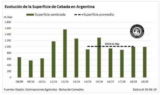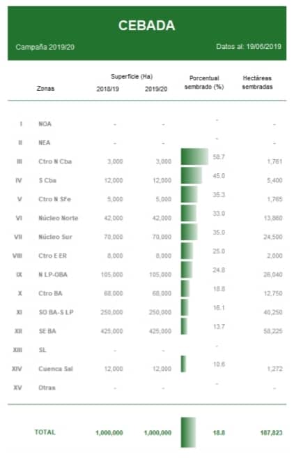 Se inicia la campaña 2019/20 para el cultivo de cebada, con una siembra a nivel nacional que ya alcanza el 18,8 % de la superficie proyectada para este año en 1.000.000 ha. A la fecha, las labores registran un adelanto interanual de 2 puntos porcentuales.