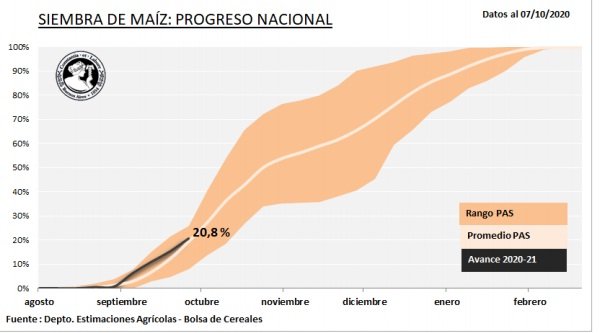 Durante la última semana la siembra de maíz con destino grano comercial comenzó a desacelerarse en el centro del área agrícola. La falta de humedad en los primeros centímetros del perfil en las provincias de Córdoba y Santa Fe, ponen en riesgo la concreción de la superficie presupuestada con planteos tempranos. Diferente es la situación en las provincias de Buenos Aires y La Pampa, donde las lluvias relevadas los días previos mantienen las buenas condiciones para la incorporación del cereal. El avance de siembra registrado se ubica en el 20,8 % de nuestra actual proyección de siembra para la campaña 2020/21 de 6.300.000 Ha. Esta superficie representa en números absolutos, 200.000 Ha menos que las implantadas la campaña previa (Campaña 2019/20: 6,5 MHa).