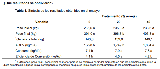 Al inicio del ensayo, y como se planificó al asignar los animales a los tratamientos, el peso fue similar en los diferentes tratamientos. Al concluir el ensayo, todos los animales alcanzaron un nivel de gordura apto para faena. Aquellos que recibieron el nivel mayor de arveja (T40) tuvieron mayor peso, siguiéndole el grupo que recibió 20% de arveja y por último el que solo recibió maíz y núcleo (0% de arveja). El grupo que recibió el mayor nivel de arveja también presentó la mayor ganancia diaria de peso (1,864 kg/día) respecto al promedio de los otros dos (1,774 kg/día) y una tendencia a mayor eficiencia de conversión (diferencia no significativa respecto al testigo). El mayor consumo encontrado en los tratamientos con arveja se puede atribuir a la excelente palatabilidad que posee este grano de leguminosa.