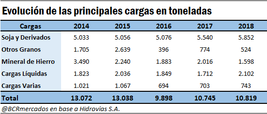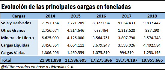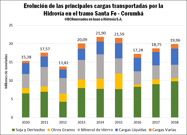 A partir de la caída de 2016, las cargas se incrementaron en 2,68 Mt, lo que implica un crecimiento del 15,5%. Este crecimiento se sustenta principalmente por el aumento en el transporte fluvial de Soja y Derivados, que sumaron más de 1,5 Mt (aumento del 18,2%), y de Cargas Líquidas, que contemplan principalmente aceite de soja y combustibles, con un incremento de más de 720 mil toneladas (19,7%).