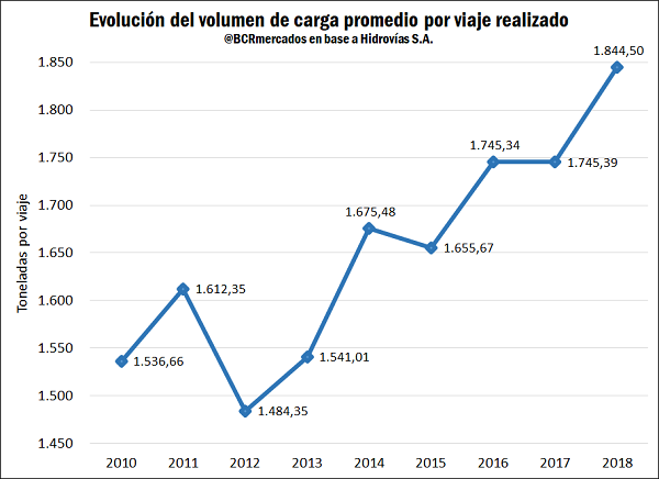 El tonelaje promedio transportado ha mostrado un crecimiento sostenido desde comienzos de la década, evidenciando un incremento del 20% al pasar de 1.536,7 a 1.844,5 toneladas. Los mayores avances se dieron en el rubro Mineral de Hierro, donde el volumen promedio transportado se incrementó un 47,6% para llegar a las 2.237 t, y en Cargas Varias, con una carga media de 2.094,7 tras un aumento del 47,2%.